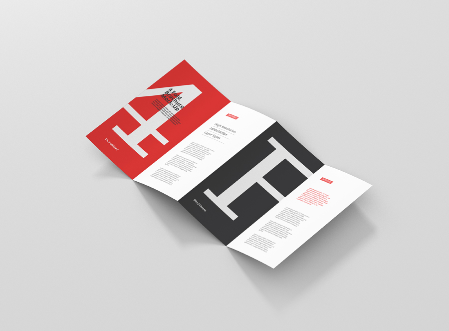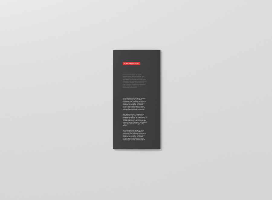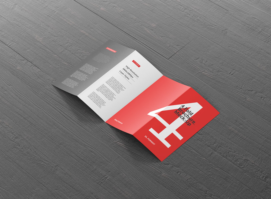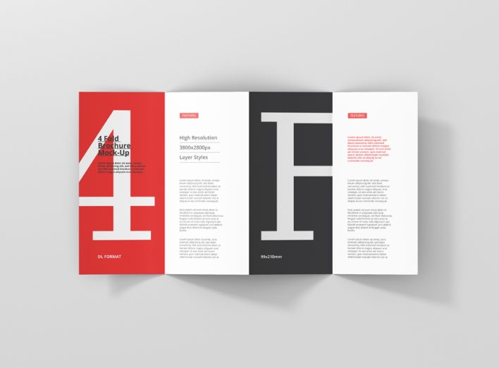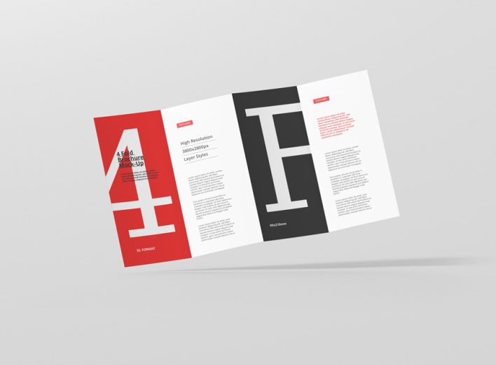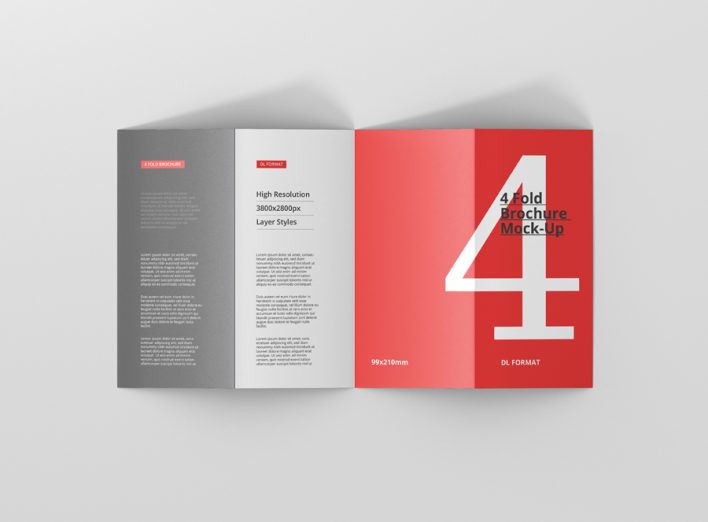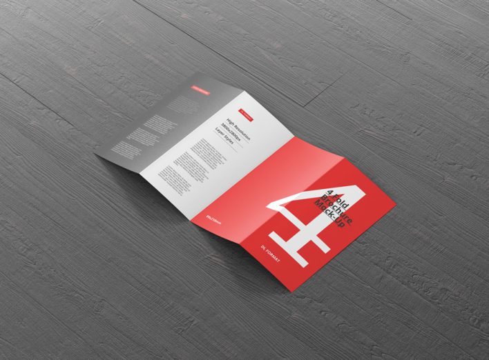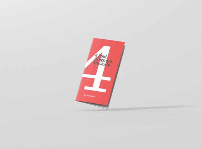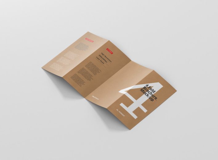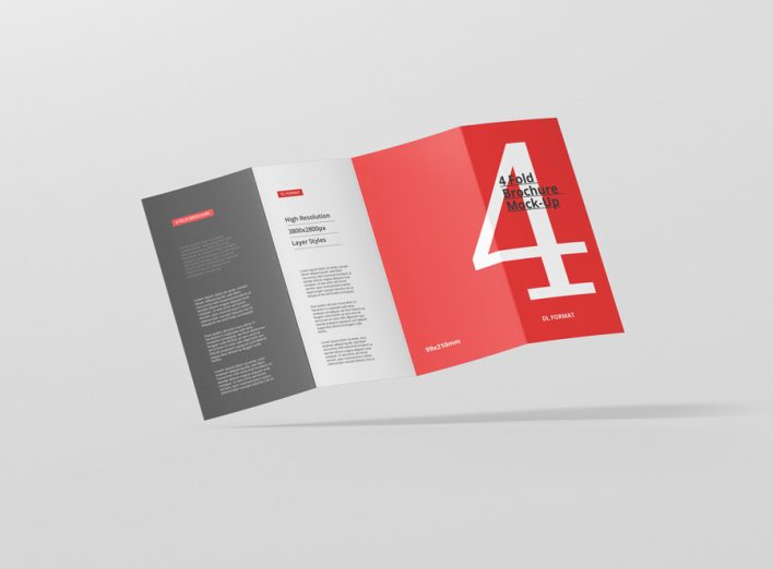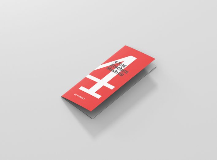 High resolution 4-fold brochure mockup in dl format. Use it for print design, portfolio, showcase, ads, banner and more. Organized and named layers make it easy to use. Great for web and print purposes. Format DL – 99×210mm (4 Panels)