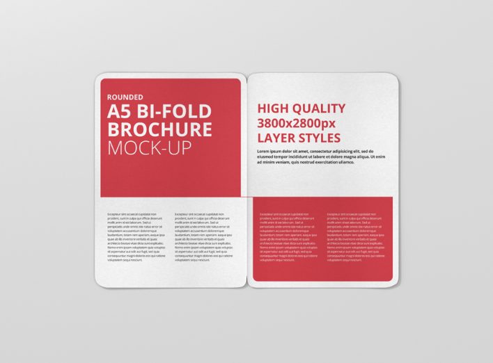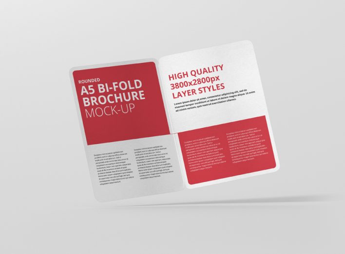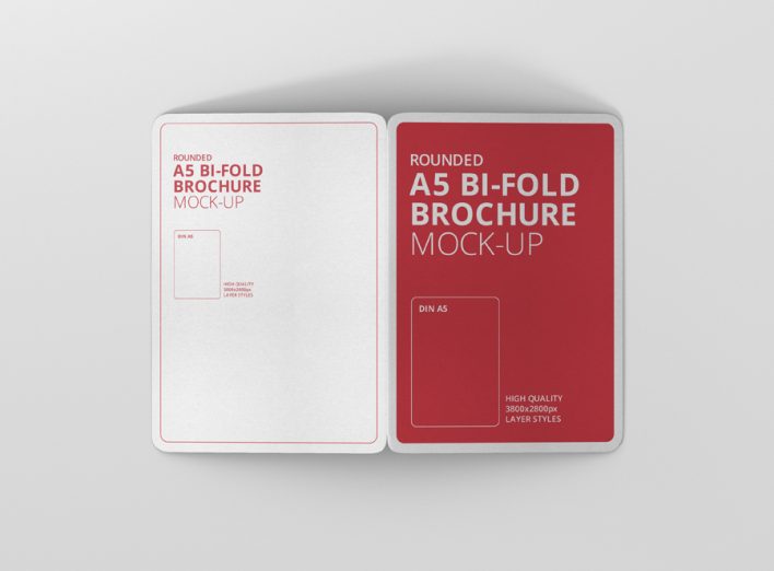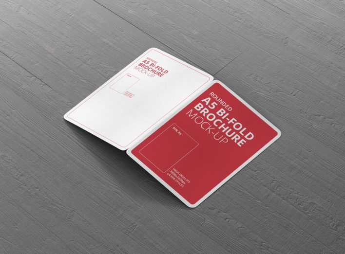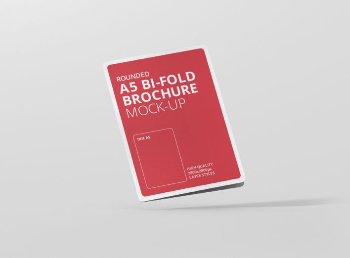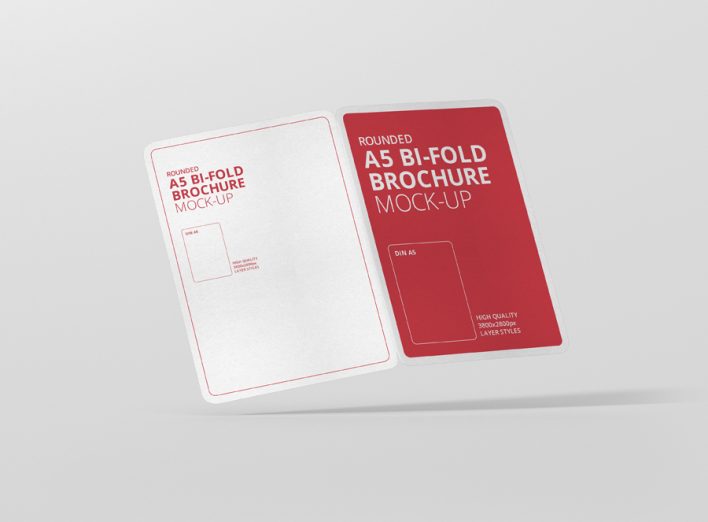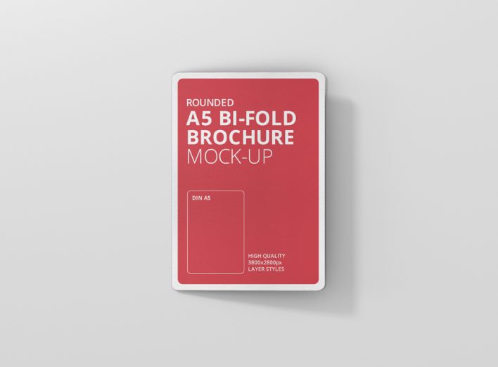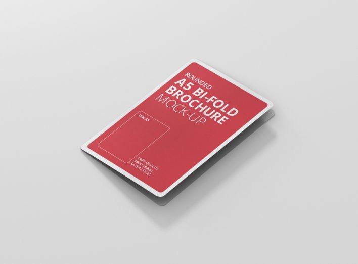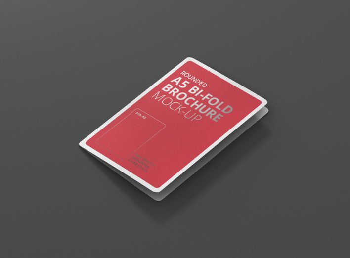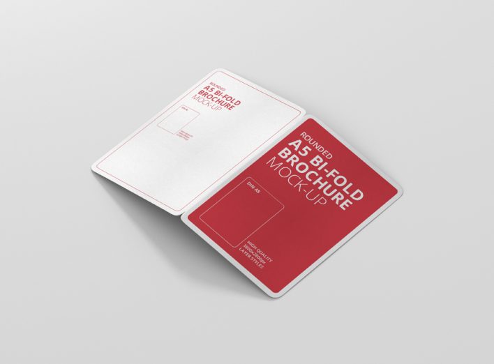 Easy to customize A5 Bi Fold Brochure Mockup with rounded corners. This package contains 11 psd mockups in different angles and views and comes with layer styles to create foilstamp or letterpress effects.